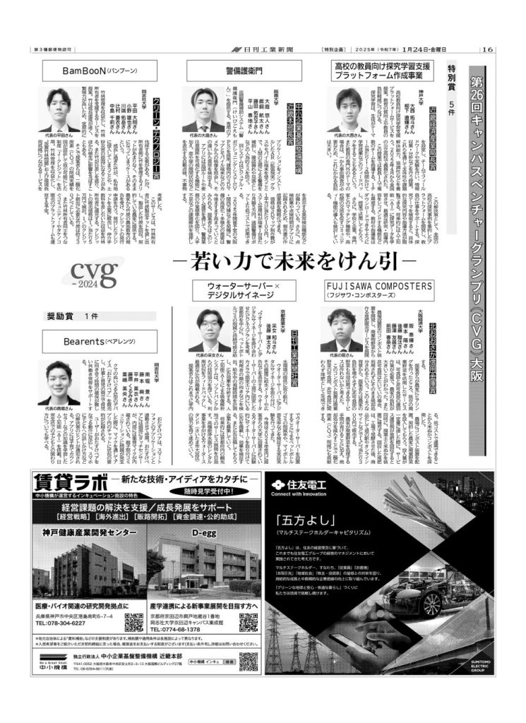 先日参加した「第26回キャンパスベンチャーグランプリ(CVG)大阪大会」が、日刊工業新聞に掲載されました。